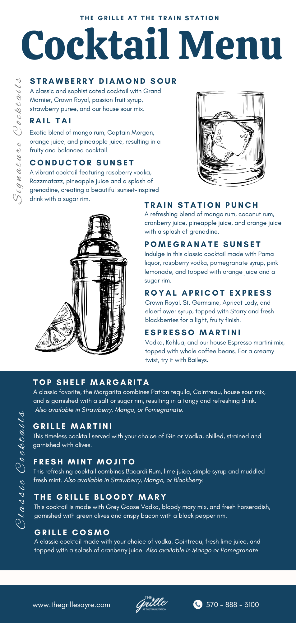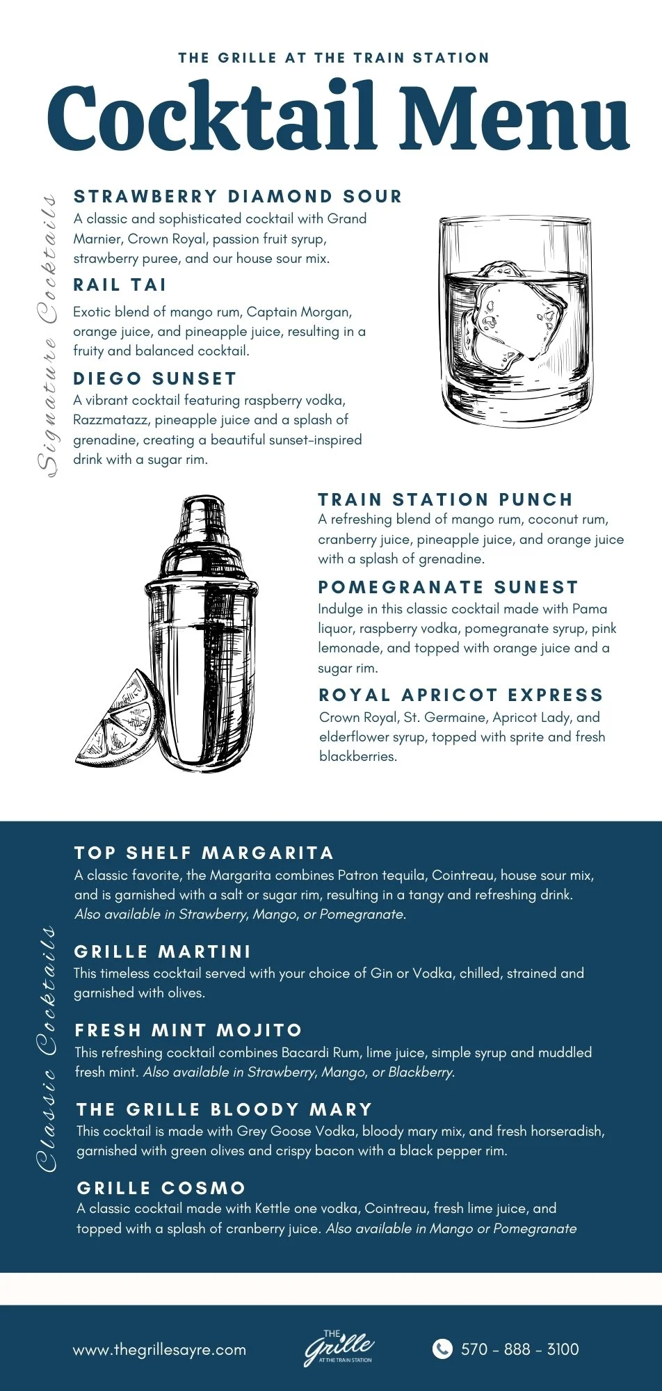 Discover a carefully curated selection of cocktails, beer, and wine at The Grille. Our cocktail menu features classic favorites and innovative creations, crafted to complement your meal. Choose from a variety of local, regional, and seasonal brews.
